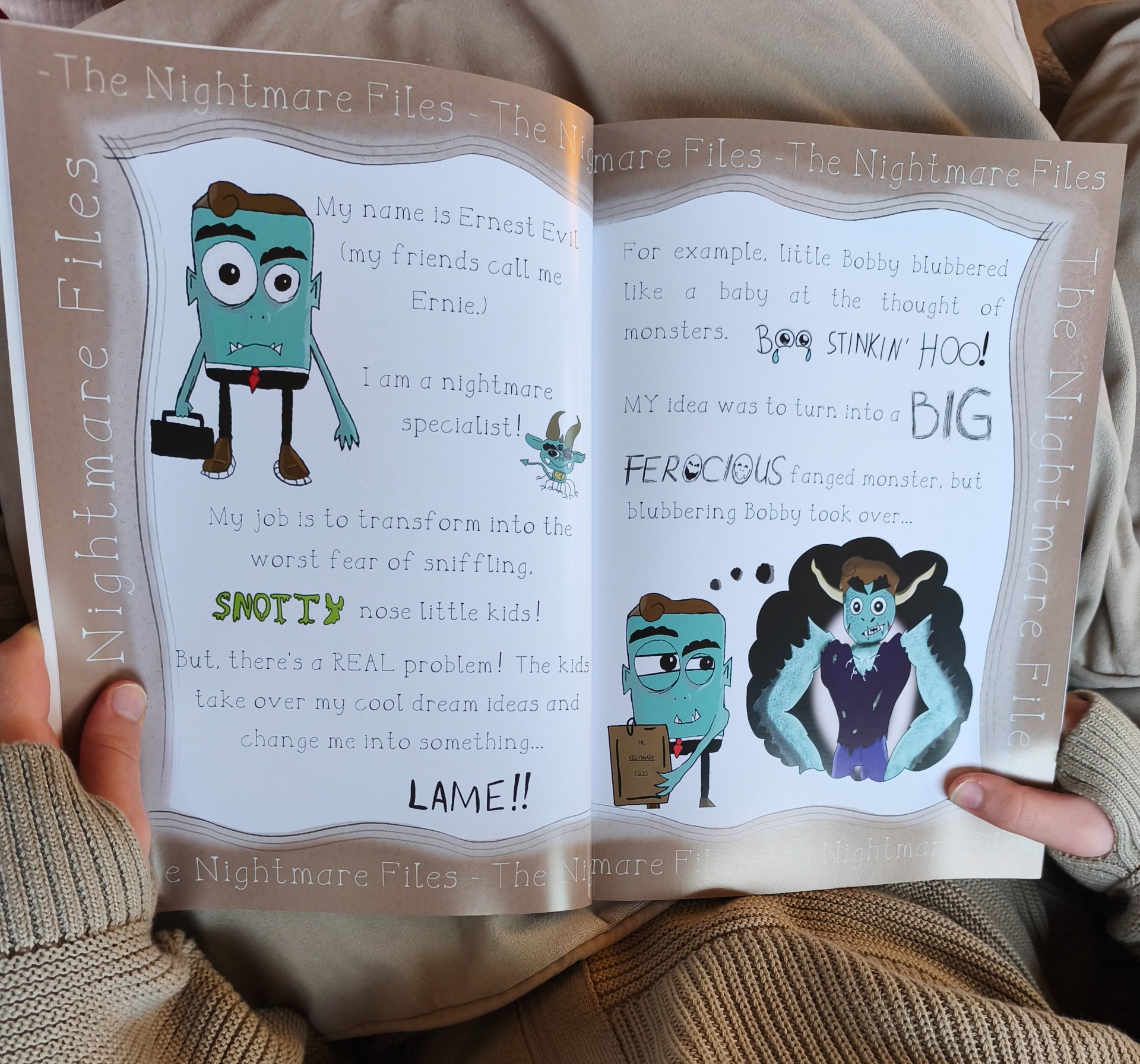Ernie Evil and the nightmare job was lovingly hand drawn by Bobby when he was 10 years old and wanted to create a story following the main character (Ernie Evil) and his journey to an epic meltdown when his dream job as a nightmare specialist turns sour. Every time he tries to morph into a terrifying nightmare, the kids imagination takes over and transforms him into something lame, until one day he can't take it anymore!